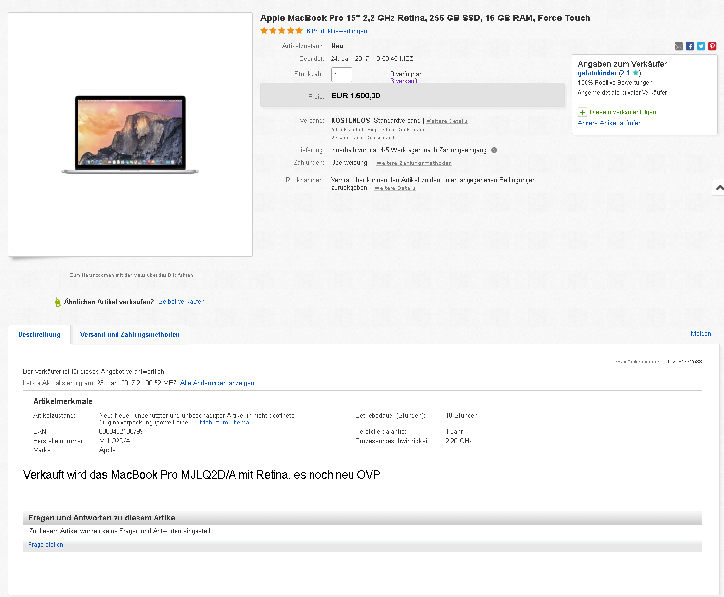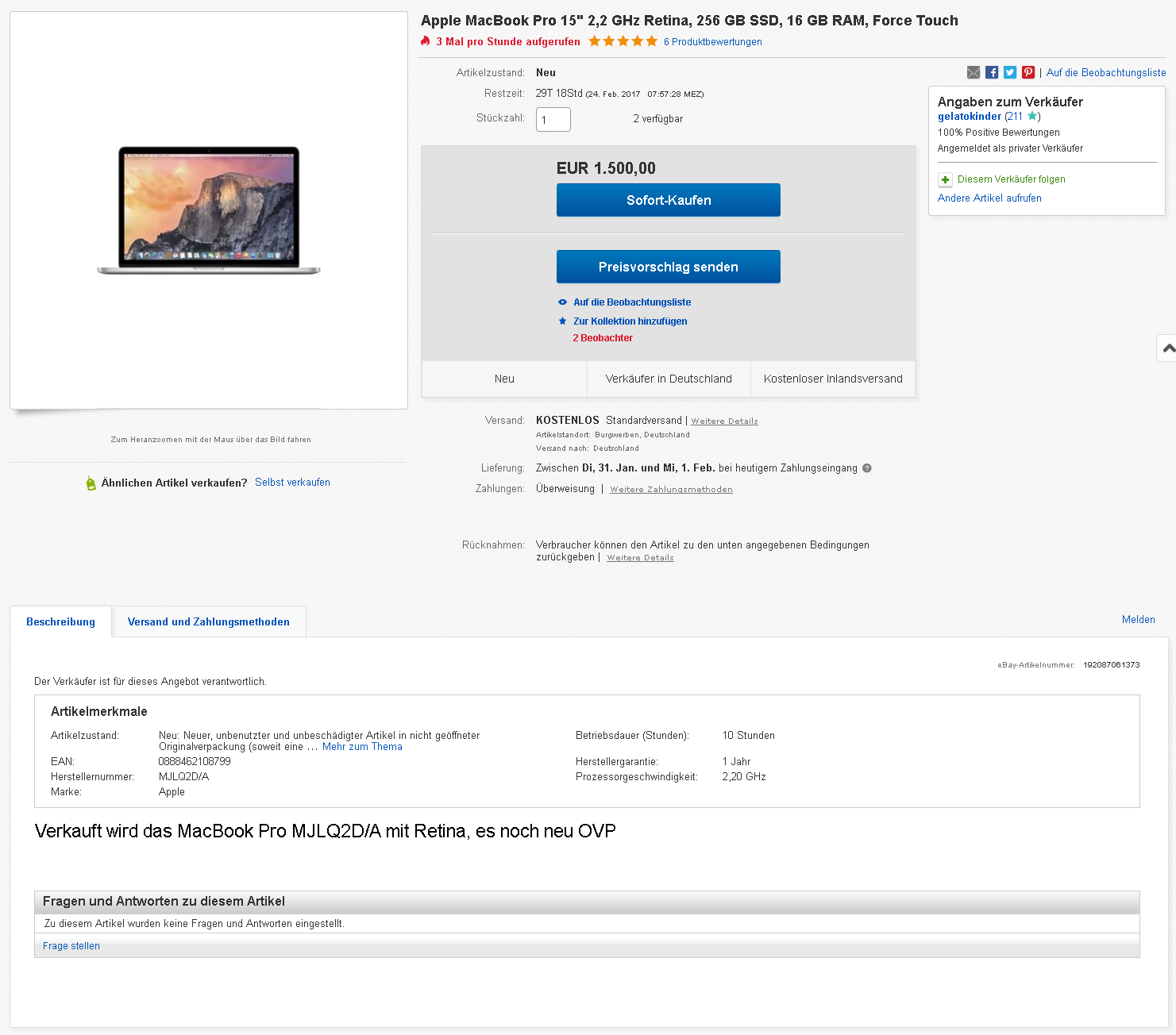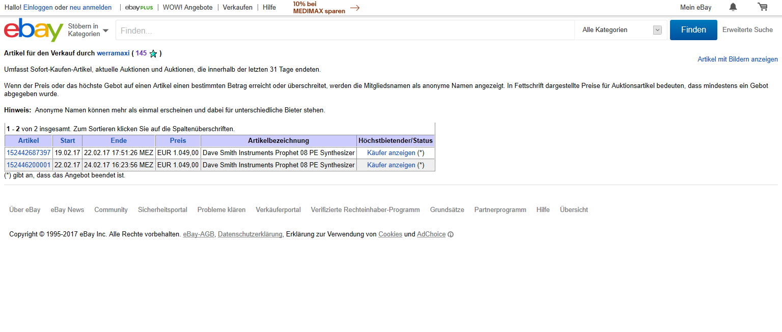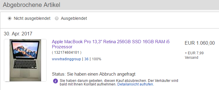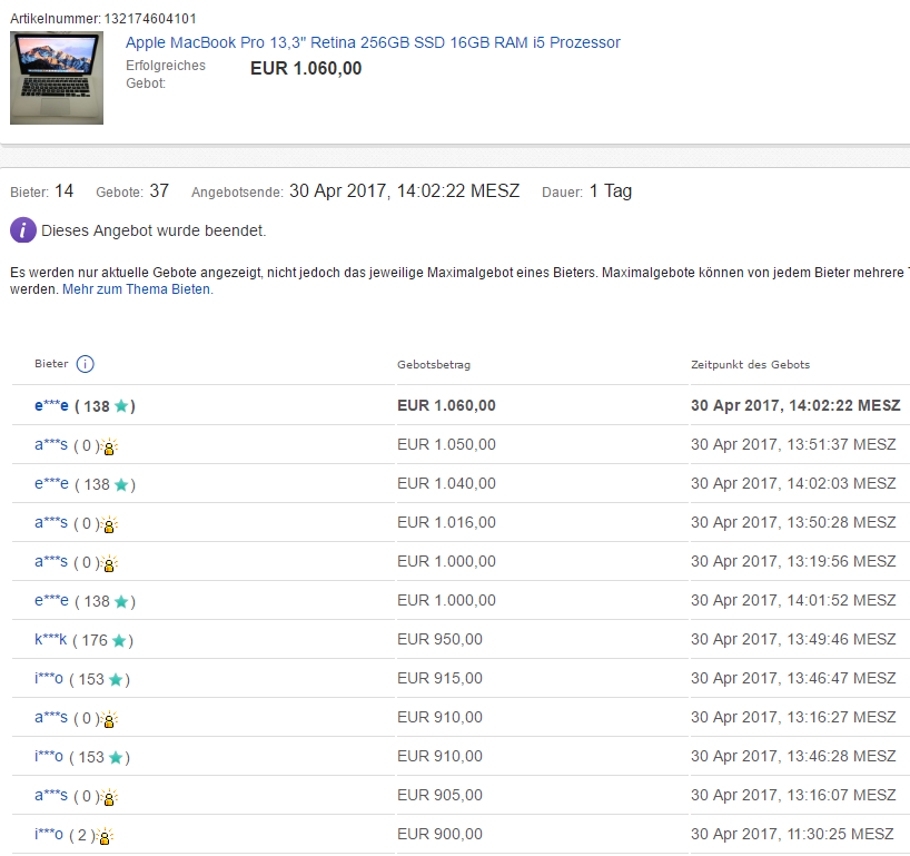 interessant zu sehen, wie viele macbook pro auktionen von personen mit max 30 bewertungen verkauft werden. bei der samsung evo 850 ebenfalls. jetzt weiß ich, warum mein macbook erst nach 2 wochen verkauft war. hab auch nur überweisung angeboten und mit diesem ebay namen knapp über 100 bewertungen.