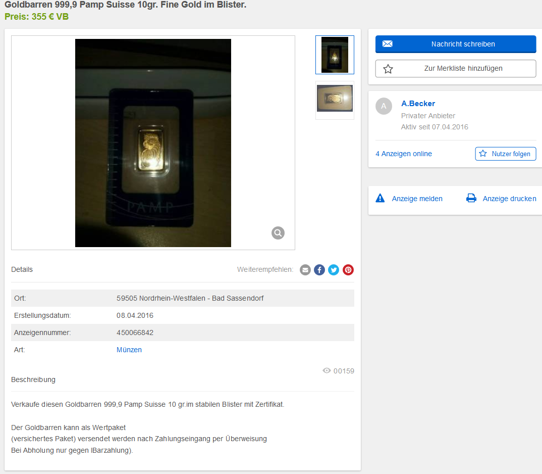 ebay-kleinanzeigen, Pamp Suisse Goldbarren mit der AnzeigenNr: 450066842