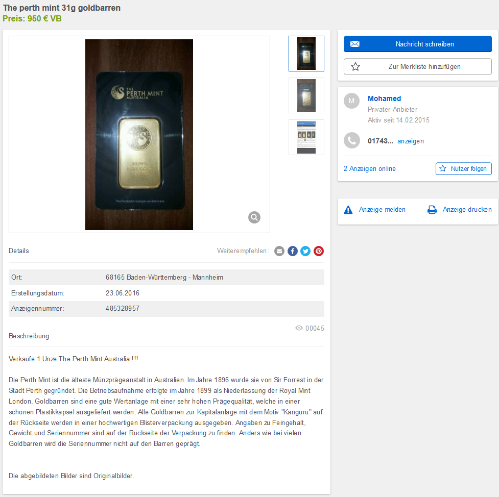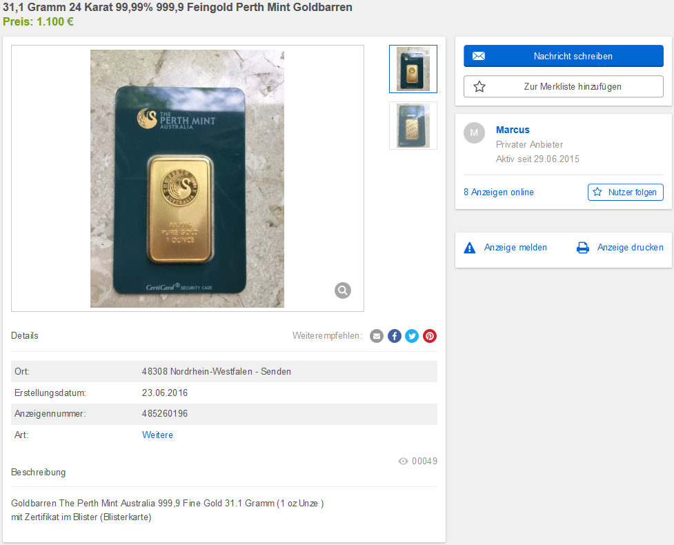 ebay-Kleinanzeigen, 10g Umicore Goldbarren mit der AnzeigenNr: 483925713