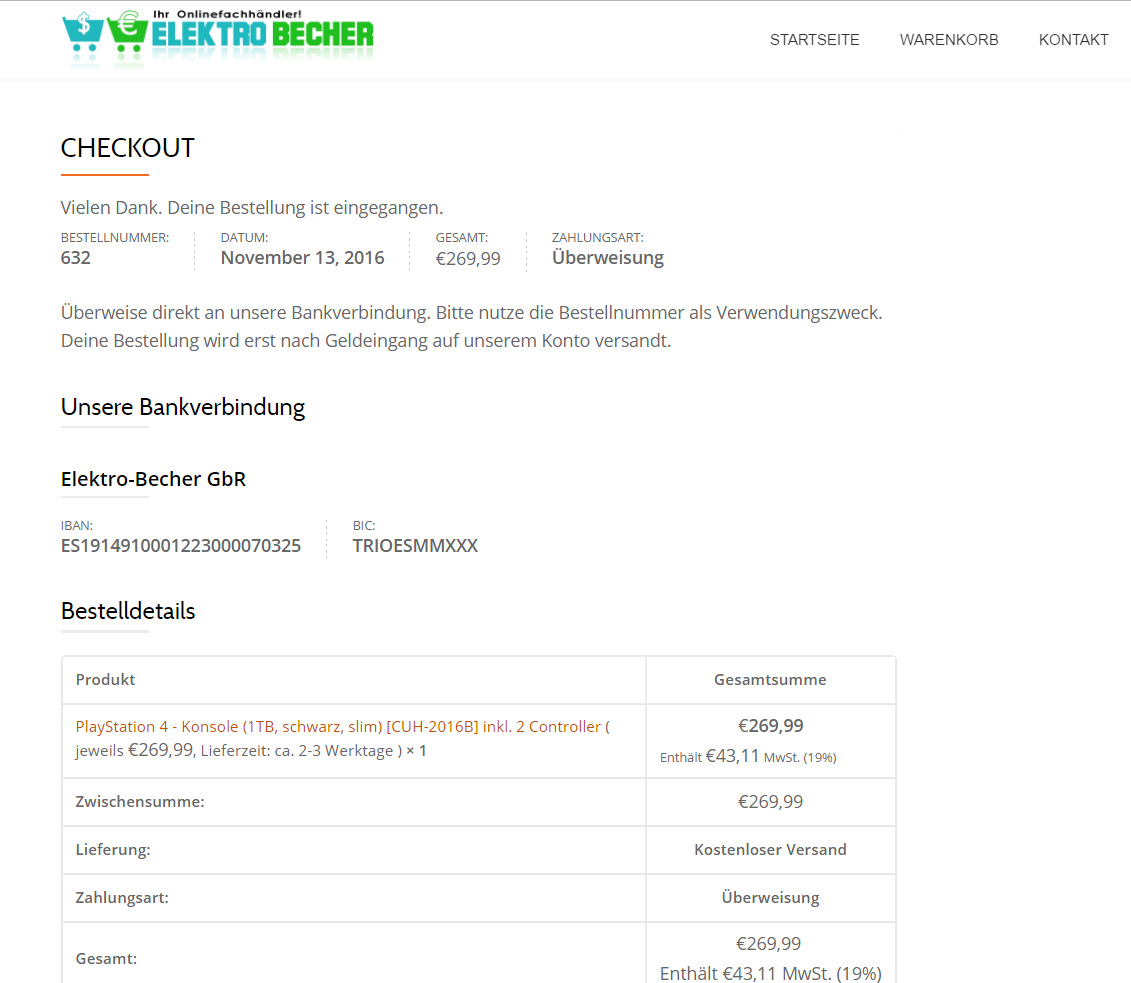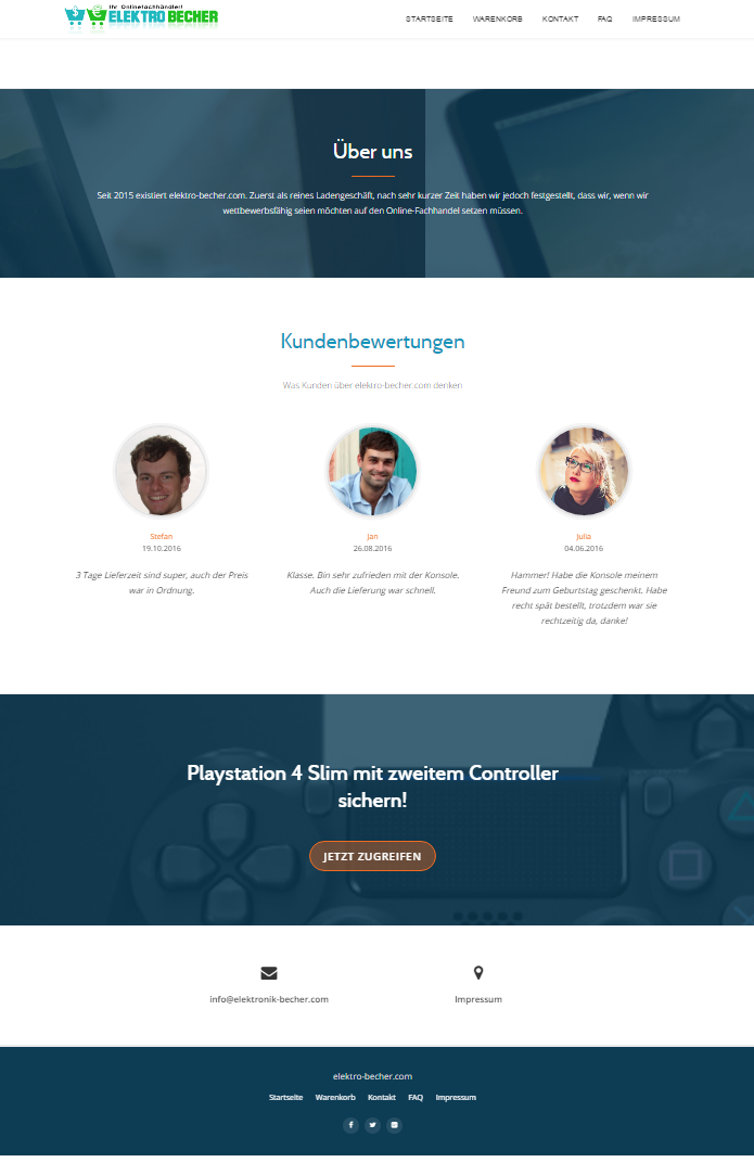 Fakeshop elektro-becher.com bietet die Playstation 4 1 TB inklusive 2 Controllern für 269,99 Euro an! Rechtswidriges Impressum ohne Angabe einer einzigen Kontaktmöglichkeit, Daten scheinen frei erfunden worden zu sein und lassen sich nicht verifizieren. Eine Elektronik-Versand24 GbR existiert nicht. Keine ordentliche Widerrufsbelehrung mit entsprechendem Formular vorhanden! Nur Vorkasse per Überweisung, hier gibt´s definitiv keine Ware!