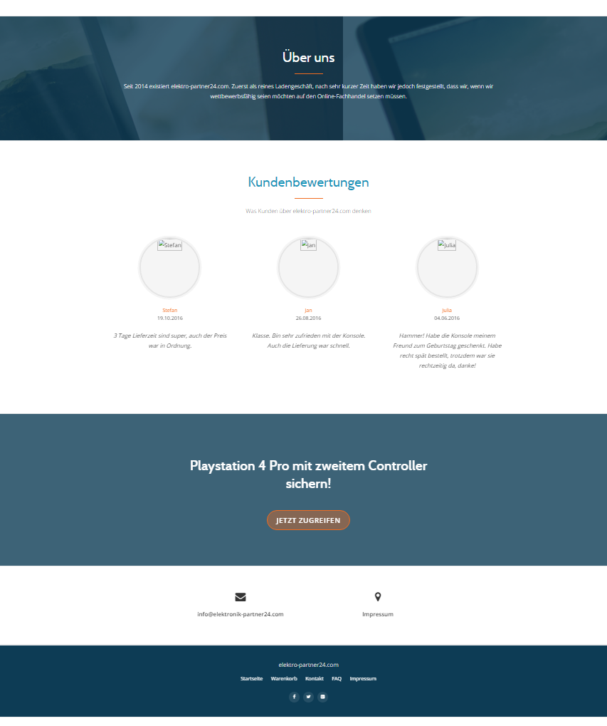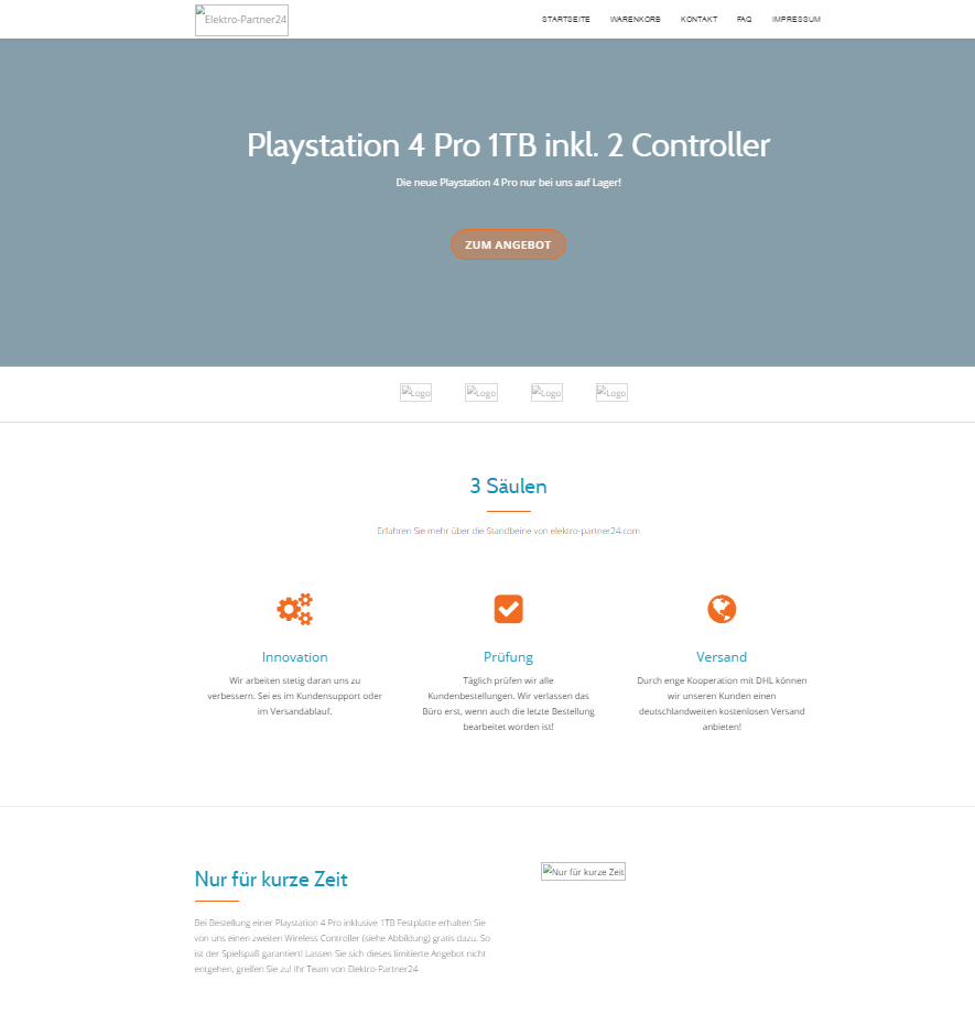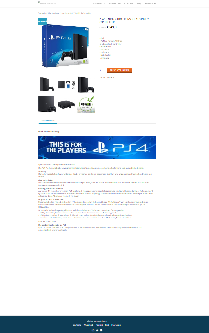 Fakeshop elektro-partner24.com mit der Playstation 4 1 TB inklusive 2 Controllern. Rechtswidriges Impressum ohne Angabe einer einzigen Kontaktmöglichkeit, Daten in diesem Fall gestohlen von real existierenden Personen. Eine Elektronik Bock GbR existiert allerdings nicht. Auch hier keine ordentliche Widerrufsbelehrung mit entsprechendem Formular vorhanden! Nur Vorkasse per Überweisung möglich, hier gibt´s definitiv keine Ware!