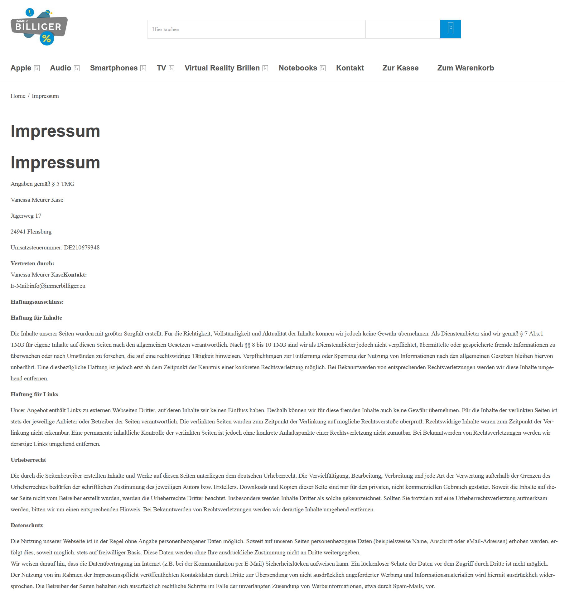 Rechtswidriges Impressum, die Daten der darin benannten Personen wurden entweder frei erfunden oder gestohlen und werden nun für betrügerische Zwecke missbraucht. Auf Angabe eines HR-Eintrags verzichtet man lieber gleich, gültige UST-ID wurde gemopst. Zahlungsmöglichkeiten: Nur Vorkasse per Überweisung.