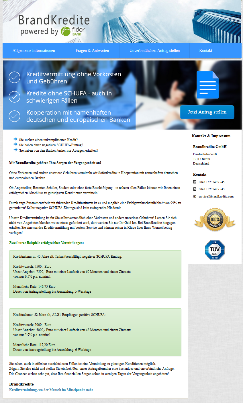 Kein Impressum in vorgeschriebener Form vorhanden, unter "Kontakt" benannte Brandkredite GmbH existiert nicht. Zu finden sind diese Angaben im rechten Teil der Webseite. TÜV-Zertifikat ist ein Fake ohne weiterführenden Link.