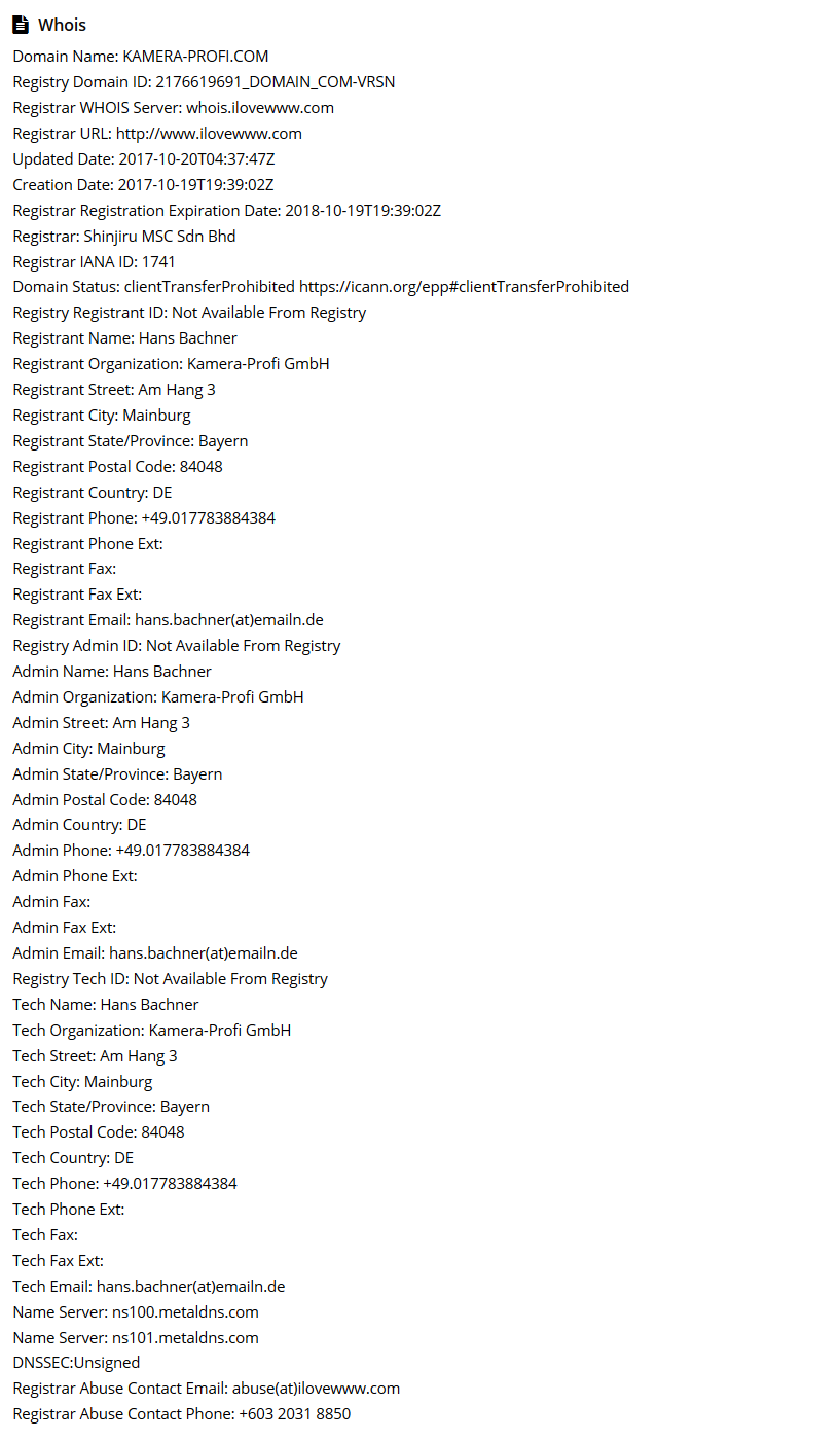 Rechtswidriges Impressum, die Daten der darin benannten Personen wurden entweder frei erfunden oder gestohlen und werden nun für betrügerische Zwecke missbraucht. Eine Kamera-Profi GmbH existiert nirgendwo, der angegebene HRB-Eintrag wurde gestohlen und gehört zu einer GmbH, die mit diesem Fakeshop rein gar nichts zu tun hat. Darüber hinaus wird auch noch eine ungültige UST-ID angegeben. Zu allem Überfluss: Einzige Zahlungsmöglichkeit: Vorkasse per Überweisung!