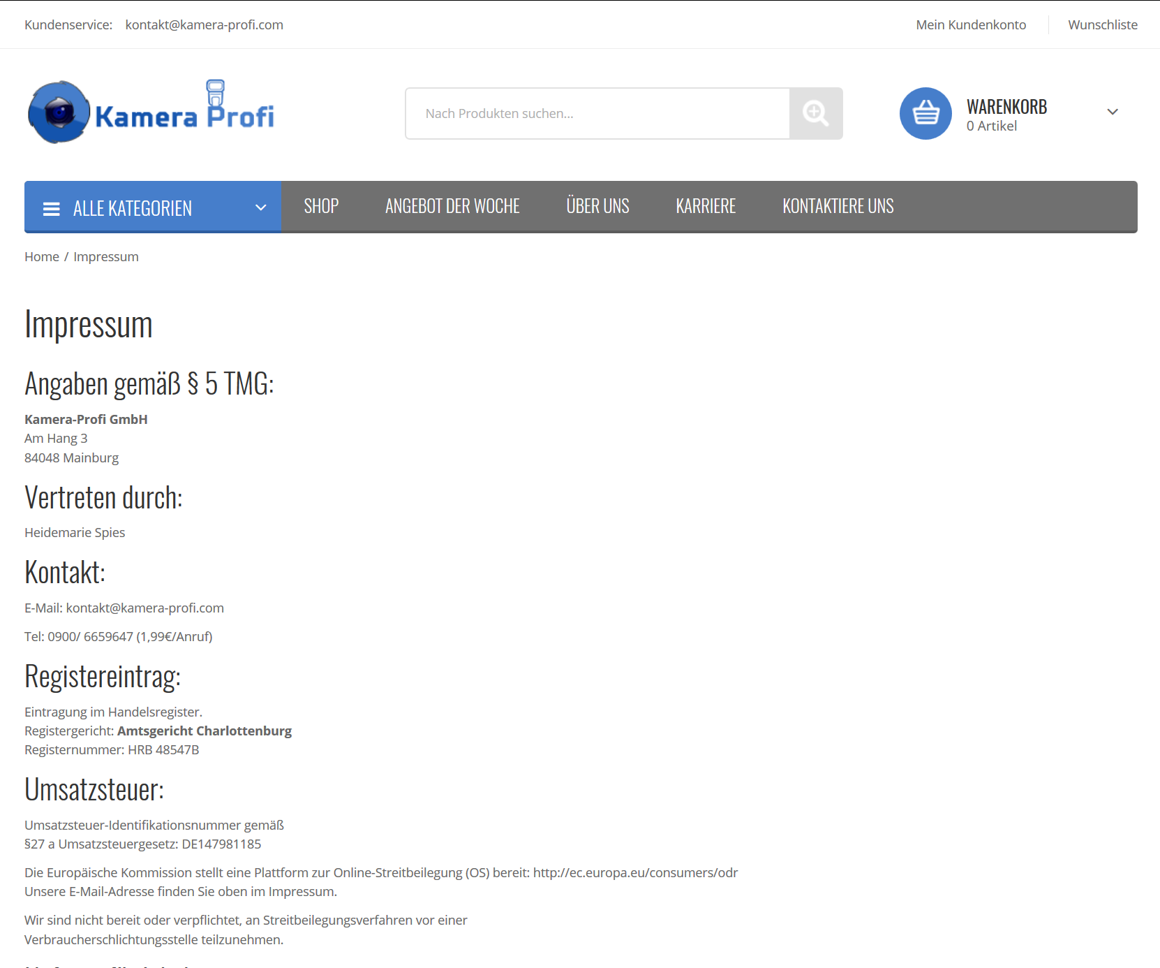 Rechtswidriges Impressum, die Daten der darin benannten Personen wurden entweder frei erfunden oder gestohlen und werden nun für betrügerische Zwecke missbraucht. Eine Kamera-Profi GmbH existiert nirgendwo, der angegebene HRB-Eintrag wurde gestohlen und gehört zu einer GmbH, die mit diesem Fakeshop rein gar nichts zu tun hat. Darüber hinaus wird auch noch eine ungültige UST-ID angegeben. Zu allem Überfluss: Einzige Zahlungsmöglichkeit: Vorkasse per Überweisung!