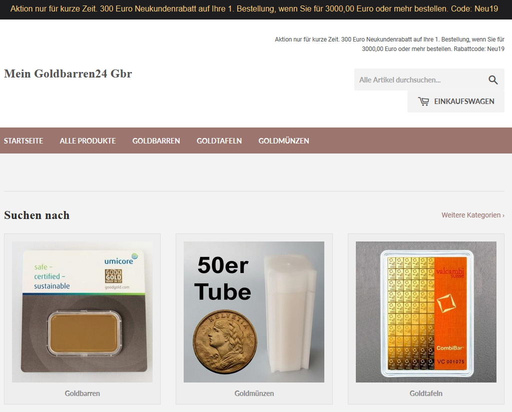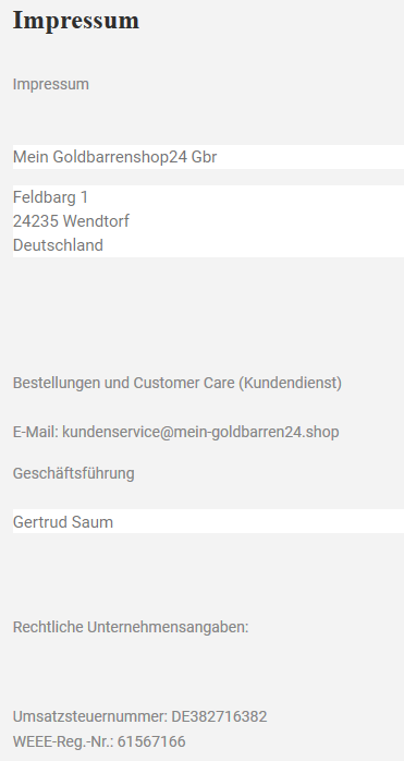 Fakeshop: mein-goldbarren24.shop - Mein Goldbarrenshop24 Gbr - Ihr Fachhändler für Goldbarren und Münzen - kundenservice@mein-goldbarren24.shop - DE382716382 - Betrugsserie mit Goldwaren