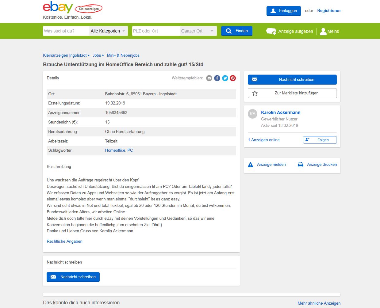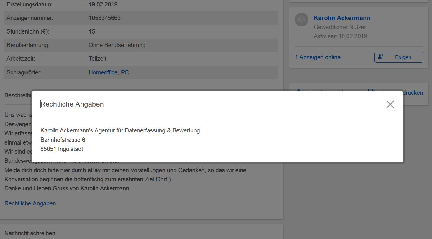 ich wurde Opfer eines Betrügers. Auf der Suche nach einem Nebenjob habe ich ein Jobangebot auf Ebay-Kleinanzeigen gefunden.