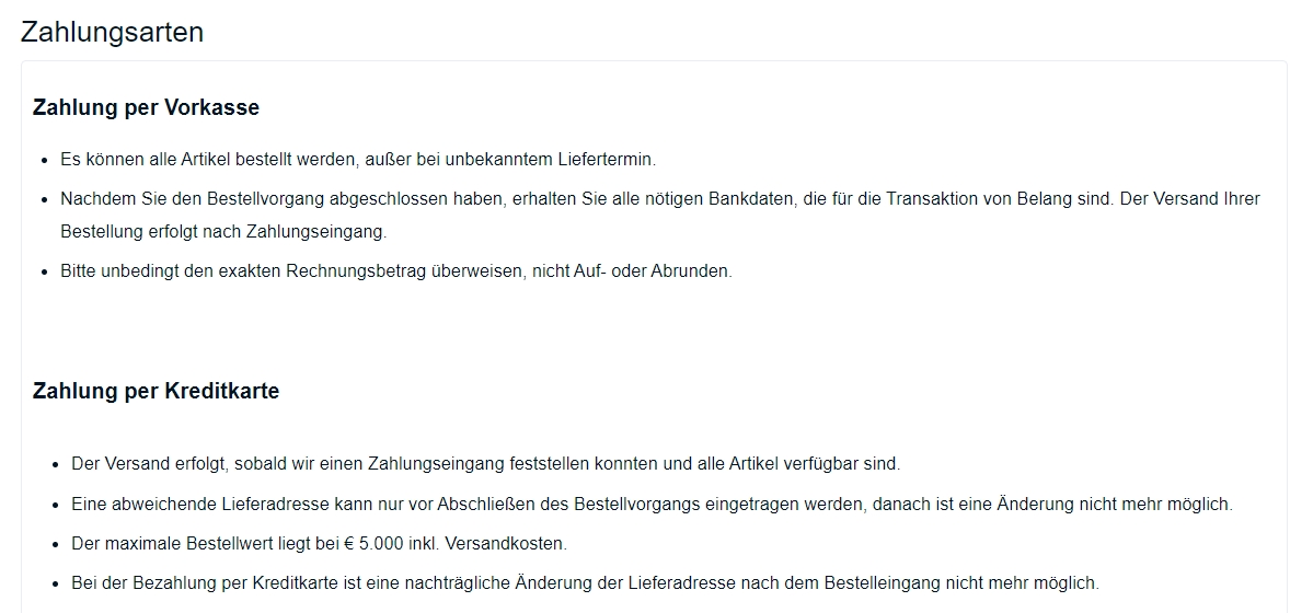 Es ist nur die Bezahlung per Vorkasse oder Kreditkarte möglich.