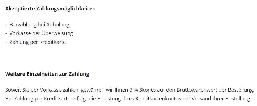 Es ist nur die Bezahlung per Vorkasse oder Kreditkarte möglich.
