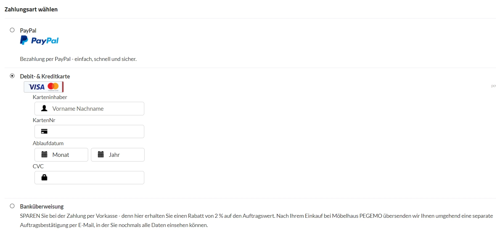 Es ist nur die Bezahlung per Vorkasse oder Kreditkarte und PayPal (!) möglich.