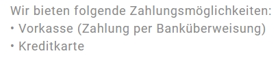 Es ist nur die Bezahlung per Vorkasse oder Kreditkarte möglich.