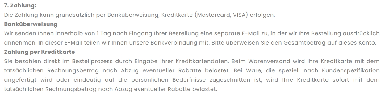 Es ist nur die Bezahlung per Vorkasse oder Kreditkarte möglich.