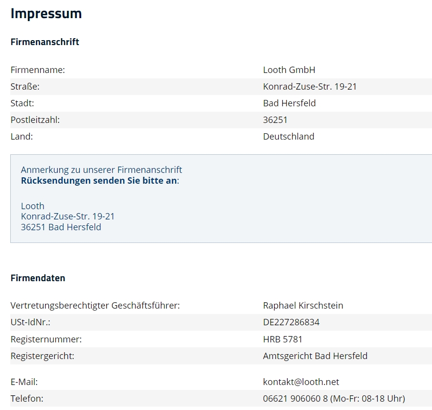 Fakeshop looth.net – Looth GmbH - Konrad-Zuse-Straße 19-21 – 36251 Bad Hersfeld, Deutschland – kontakt@looth.net – Telefon: 06621 906060 8 - DE227286834 - Alles Fake – Alles Betrug – Hier gibt es keine Ware.
