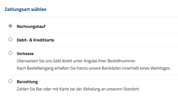 Es ist nur die Bezahlung per Vorkasse oder Kreditkarte möglich.