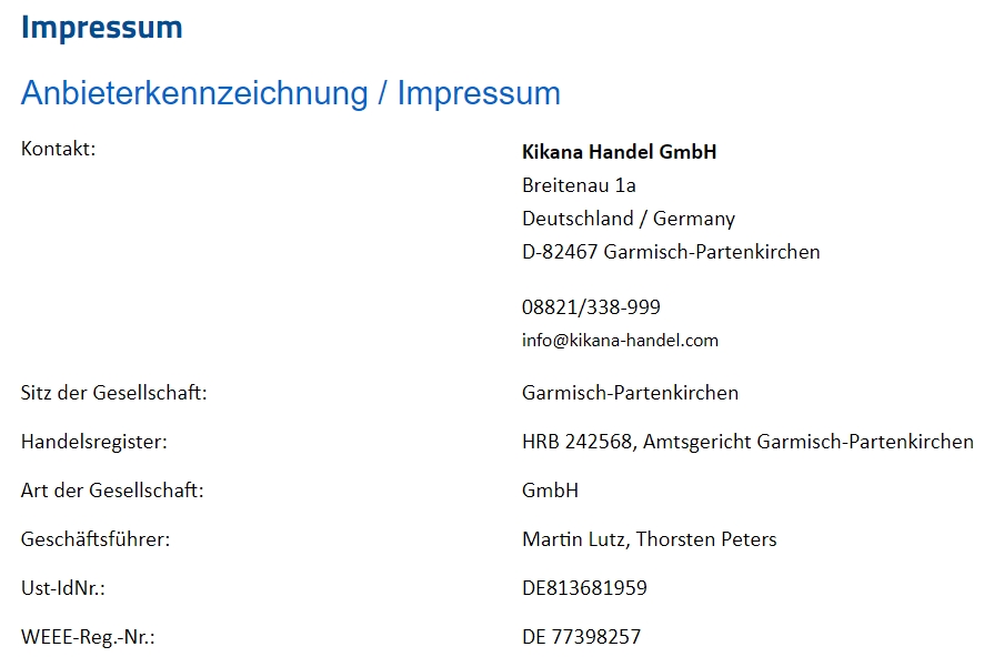 • Fakeshop kikana-handel.com – Kikana Handel GmbH - Breitenau 1a - D-82467 Garmisch-Partenkirchen – info@kikana-handel.com – 08821/338-999 - Ust-IdNr.: DE813681959 - Alles Fake – Alles Betrug – Hier gibt es keine Ware.