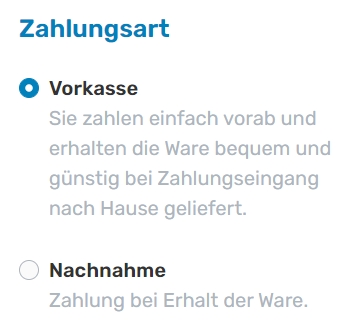 Es ist nur die Bezahlung per Vorkasse oder Kreditkarte möglich.