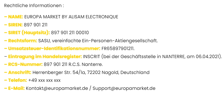 Fakeshop europamarket.de – EUROPA MARKET BY ALISAM ELECTRONIQUE - Herrenberger Str. 54/1a - 72202 Nagold - Kornmarkt 2 - 06526 sangerhausen – Kontakt@europamarket.de – +49 176 47227622 – Die Daten dieser Firma werden hier rechtswidrig benutzt – Alles Fake
