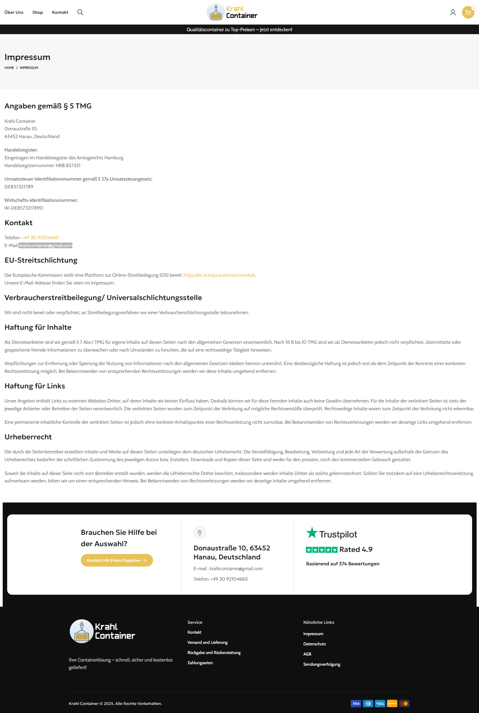 Fakeshop krahl-container.eu - Krahl Container - Donaustraße 10, 63452 Hanau - +49 30 92104660 ** 03092104660 - krahlcontainer@gmail.com​ - DE857321789 - Qualitätscontainer zu Top-Preisen – Jetzt entdecken!​