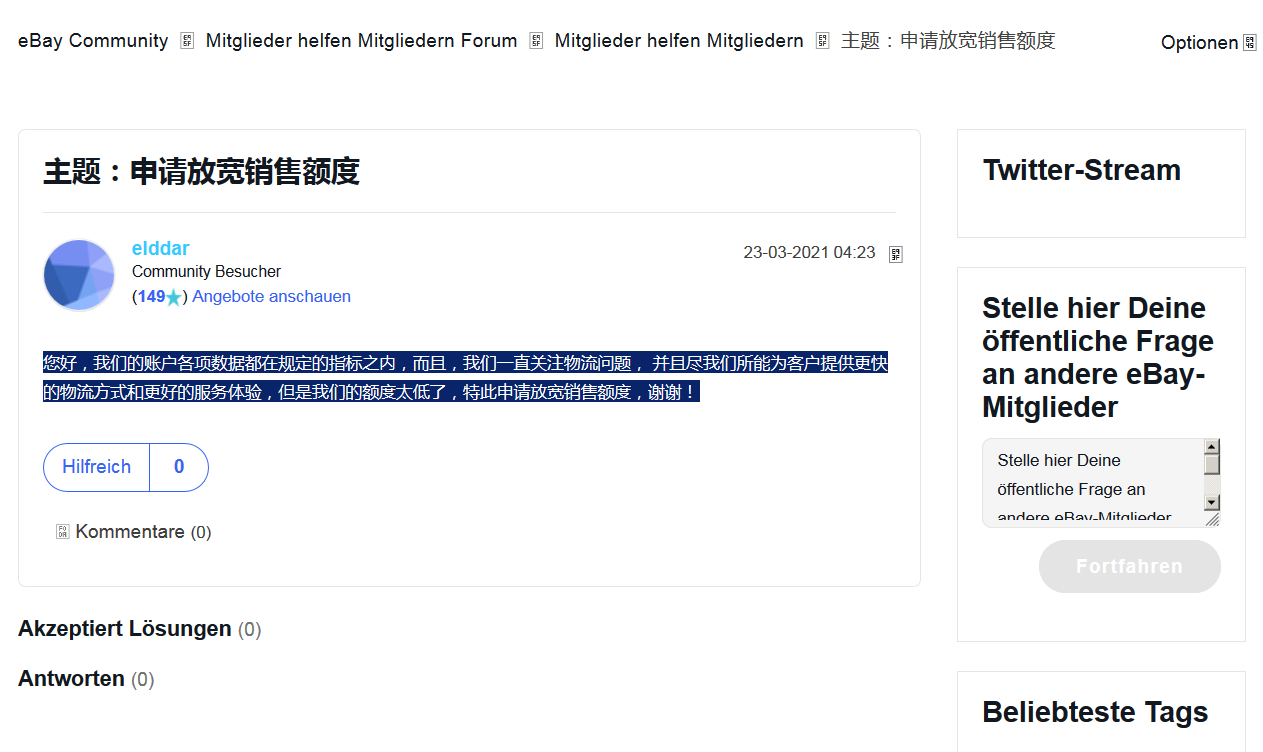 Der hat also Verkaufseinschränkungen gesetzt bekommen, weil seine Quote an nicht rechtzeitig verschickten Artikeln zu hoch ist und möchte das Limit nun aufheben lassen. Da war wohl der "Artikelstandort: Ottendorf-Okrilla, Deutschland" in Wahrheit mehr so in Richtung Um-Lei-Tung in der Provinz Lam-Ling gelegen.